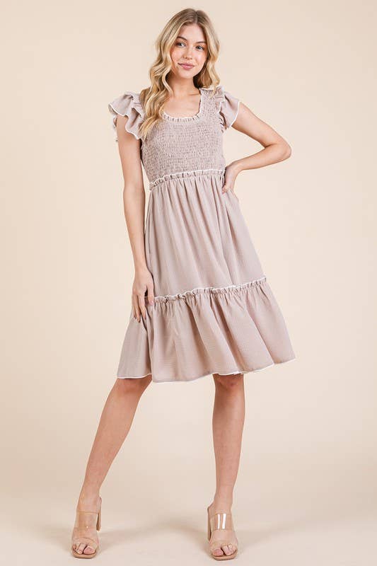 Solid Ruffle Trim Smocked Dress with Contrast: Taupe